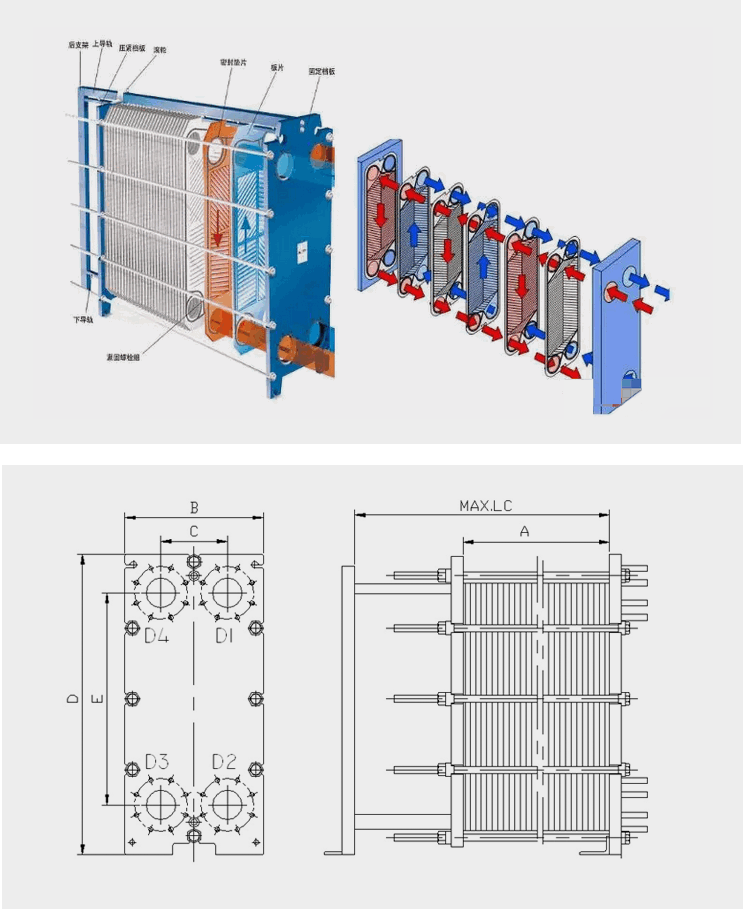 通過在一種介質與另一種介質之間傳遞熱量來加熱或冷卻一種介質。墊片式板式換熱器的由一系列波紋板組成,這些波紋板組裝在框架和壓力板之間以保持壓力,墊片充當板片之間的密封。板片兩側流體通常逆流通過熱交換器,能實現管殼式換熱器相同的工況。這提供了有效的傳熱性能?,以實現非常接近的溫差換熱,即出口工藝介質和入口服務介質之間的溫差。在帶墊片的可拆卸板式換熱器中,板片裝有彈性墊片,該墊片密封通道并將介質引導到備用通道中。板片組裝在框架板和壓力板之間,并通過擰緊安裝在這些板之間的螺栓進行壓縮。通道板和壓力板從上承載桿上懸掛下來,并通過下導向桿固定到位,下導向桿都固定在支柱上。該設計易于維護并通過減少或增加板片方便調整換熱量。板片波紋角度大小的合理搭配,可以較大提高單位換熱面積的換熱效果、調節液體的阻力、節省換熱面積,其結果降低投資成本,縮短投資回收時間。? 液體的流量、物理性質、壓力降和溫度差決定了板片的數量尺寸,液體的化學性能、腐蝕特性決定了板片及膠墊的材質,不同的波紋板結構設計不僅提高了湍流程度,并且形成許多支撐點,足以承受介質間的壓力差。